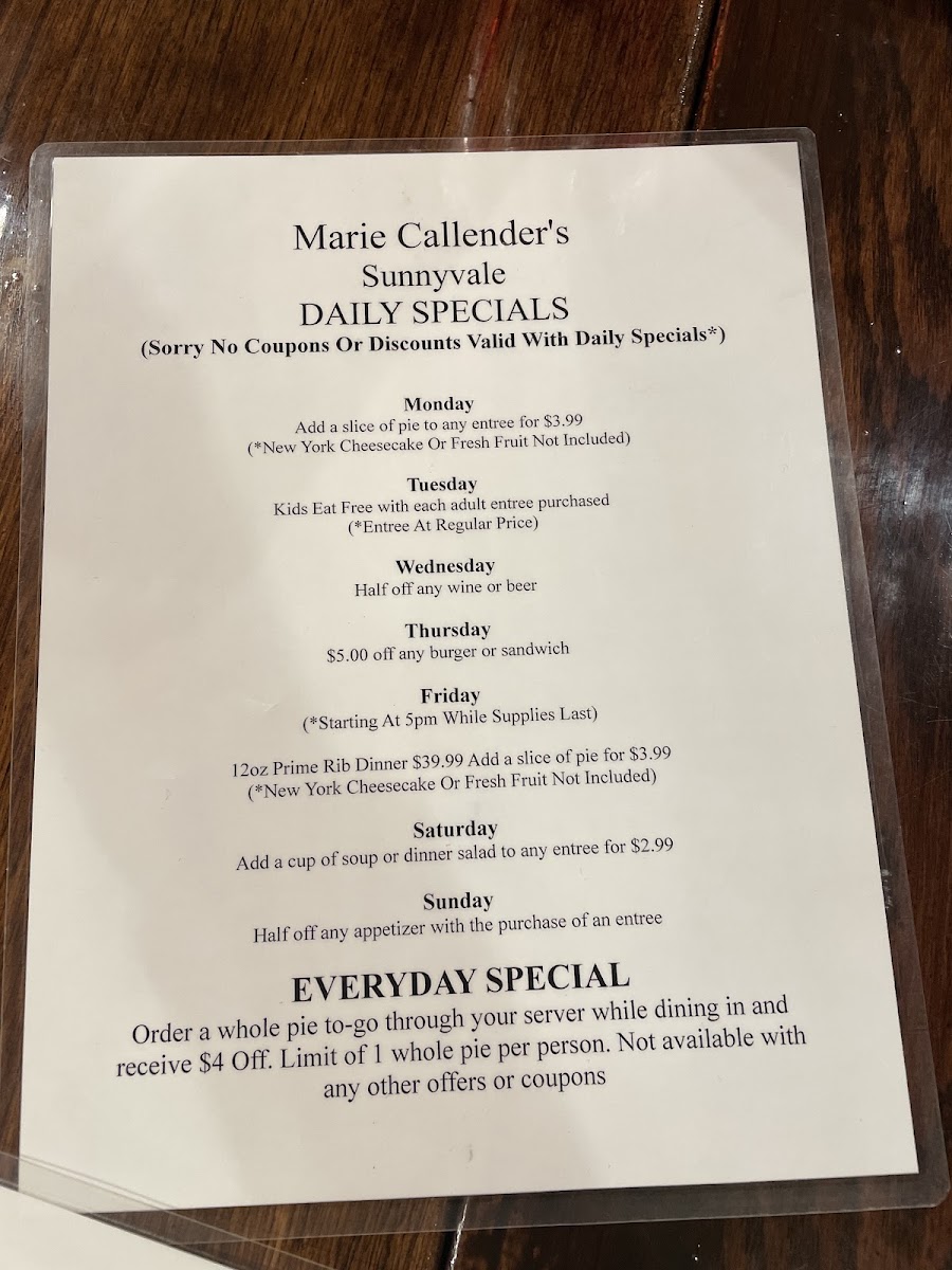 Introducing Marie Callender's, a culinary gem nestled in Sunnyvale, CA, renowned for its steadfast commitment to homestyle comfort food. This beloved brand excels in crafting hearty meals that resonate with nostalgia and flavor. At the heart of the menu is the 12oz Prime Rib Dinner, available exclusively on Fridays—a tender, juicy cut of Certified Angus Beef served with loaded mashed potatoes and seasonal veggies, all for $41.99.